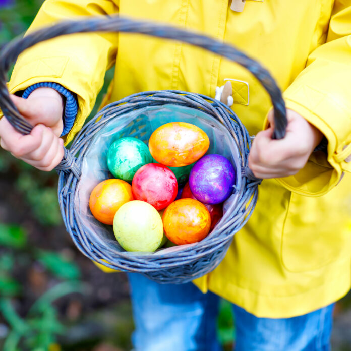 Close-up of hands of little child with colorful Easter eggs in basket. Kid making an egg hunt. child searching and finding colorful eggs in domestic garden. Old christian and catholoc tradition