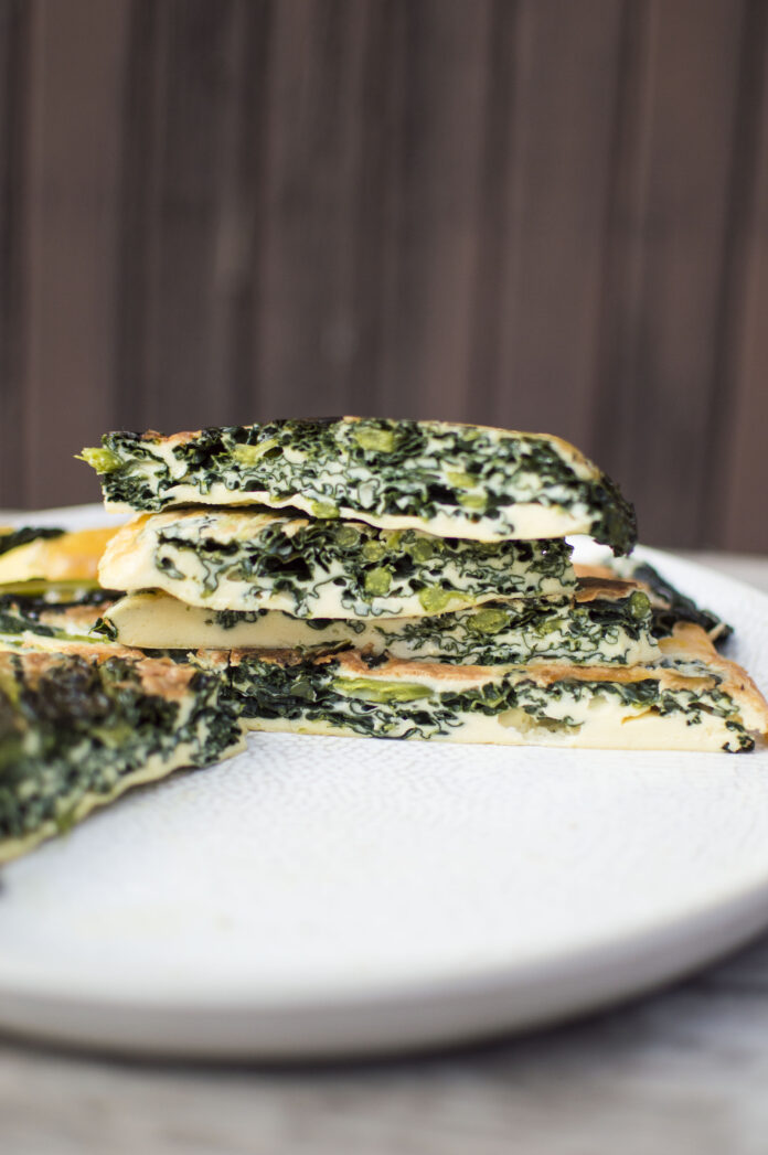 A lenti képen maradék szétcincált sonkavég, összedarabolt medvehagyma és szintén maradék, vékonyra szeletelt sajt van. Miután megsült, érdemes pihenteti fél órát, akkor nagyon szépen szeletelhető.