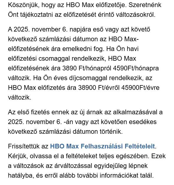 A Max platform mindkét havi és éves előfizetési opciója drágul, a Standard és a Prémium csomagok is magasabb áron lesznek elérhetők. Az emelés mértéke csomagonként eltérő.