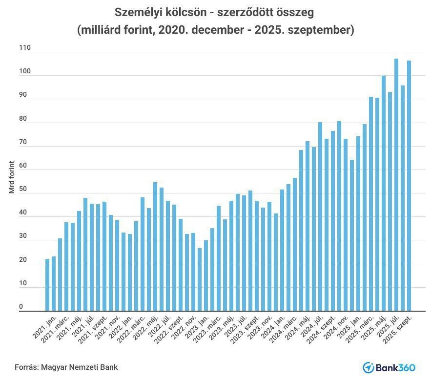 2025 első kilenc hónapjában 836,30 milliárd forintra szerződtek a háztartások, ez jelentősen, 39 százalékkal haladja meg a 2024-es eredményt. Tavaly ugyanebben az időszakban 601,05 milliárd forint fogyott személyi kölcsönökből.