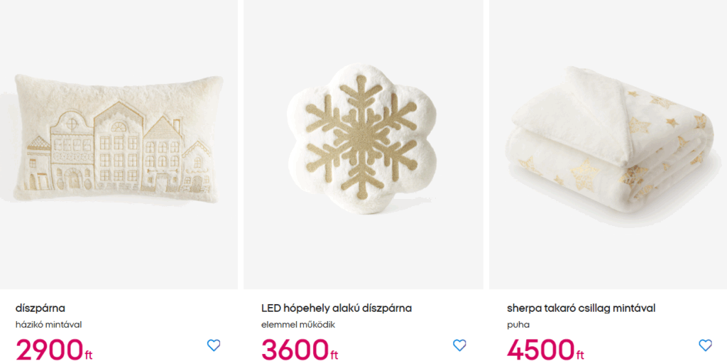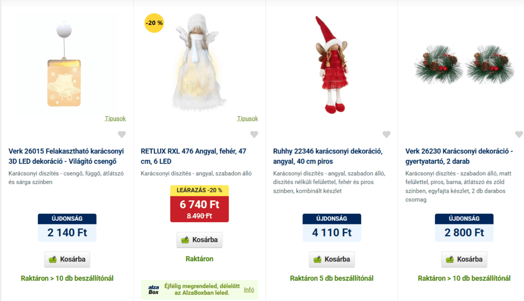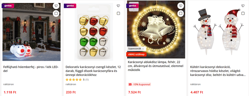 Az emag.hu szintén rendkívül sokféle dekorációt kínál az autós adventi naptáron keresztül az ablakdíszítő szettig. Kültéri, világító díszeket jó áron lehet vásárolni, akár ingyenes kiszállítással is- ez termékenként eltérő lehet.