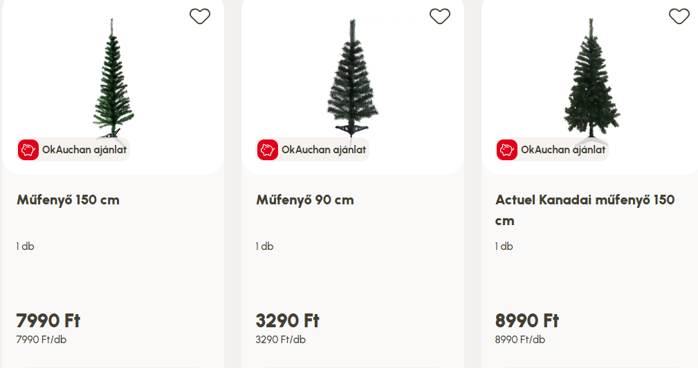 Az Auchan a várható 60-80% áremelkedésre fittyet hányva tavalyi áron kínálja a karácsonyi díszeket. Emellett az OkAuchan akciókkal még akár 40%-os kedvezményt is el lehet érni. November végétől élő fenyőfavásár is indul, a vágott fenyők ára már 4–5000 forint körül elérhető. Aki műfenyő párti, az is talál kedvére valót többféle formában és kivitelben.