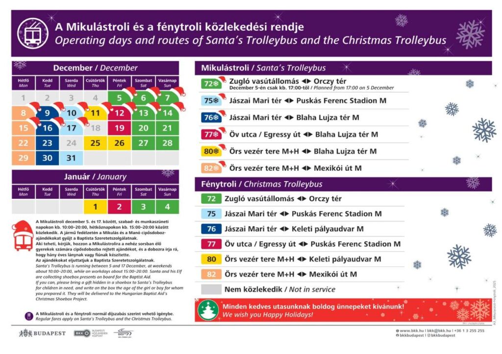 A Mikulástroli és a Mikulásbusz sem maradt ki a sorból. A feldíszített troli gyűjtőpont is: Mikulástrolin 2025-ben is találkozhattok a Mikulással és segítőjével, akik december 17-ig gyűjtik a cipősdobozba csomagolt ajándékokat, hogy a Baptista Szeretetszolgálat segítségével eljuttassák a legszegényebb gyerekeknek szerte az országban. (Az ajándékokat elhozhatod a Keleti pályaudvarnál, a Kelenföld vasútállomásnál, a Széll Kálmán téren és a Szentlélek téren található ügyfélközpontban adhatjuk le.)