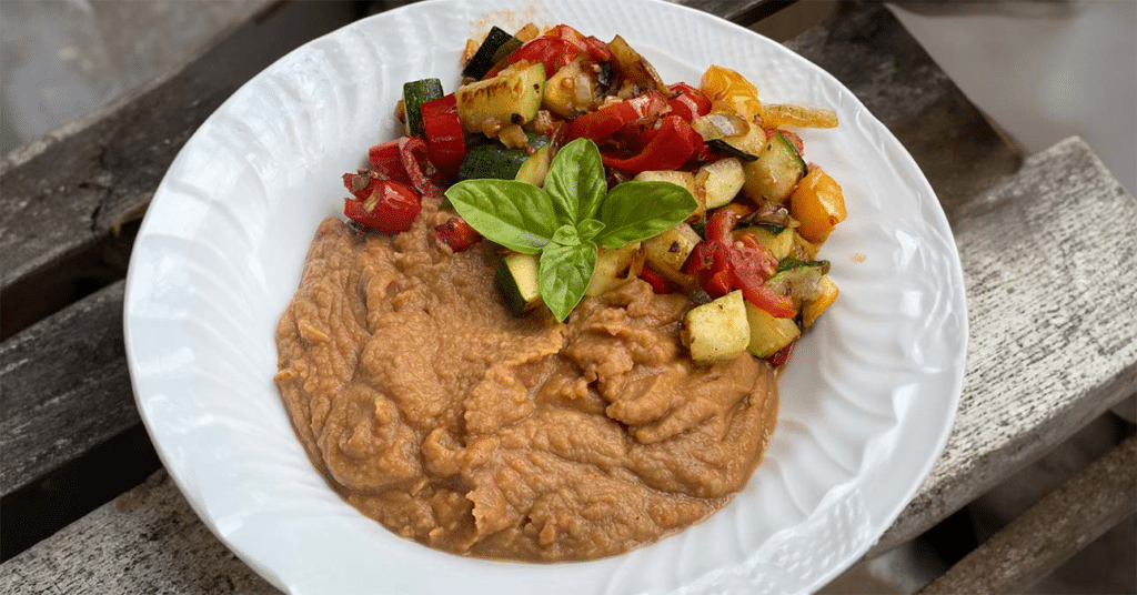 Sárgaborsó főzelék szalonnás, sült cukkinis lecsóval