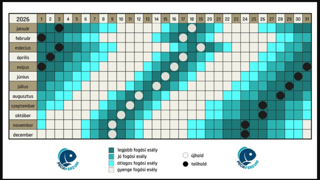A Pecaverzum a friss meteorológiai adatok alapján állította össze a 2026-os szolunáris naptárat, amely elsősorban támpontként szolgálhat azok számára, akik szeretnék tudatosabban megválasztani horgásztúráik időpontját az új évben.