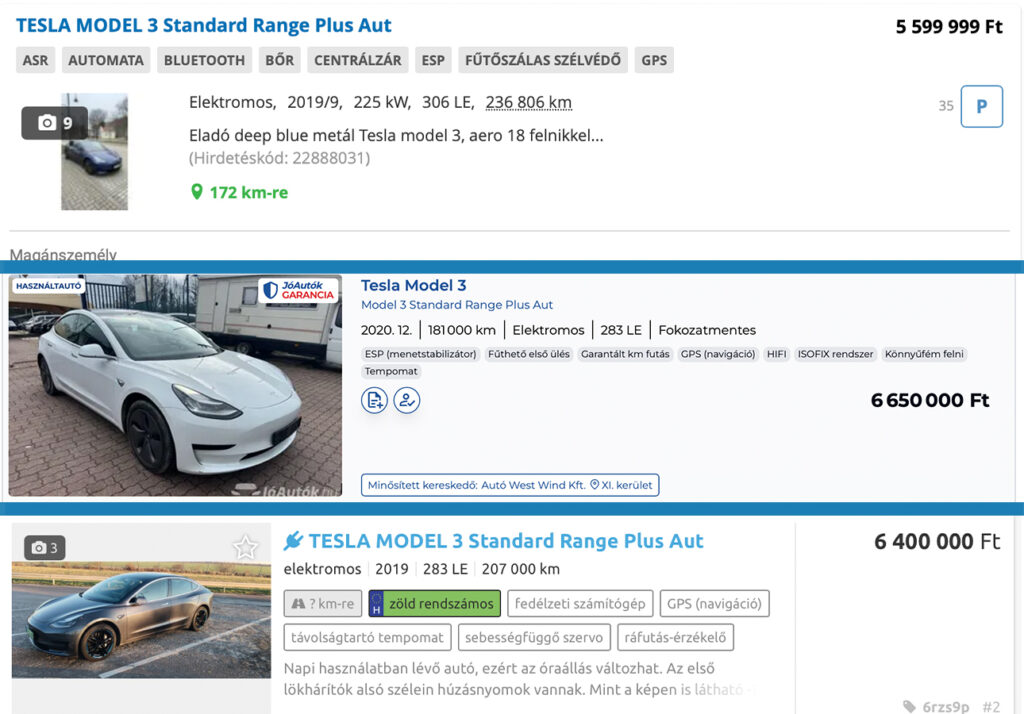 A hasznaltauto.hu-n cikkünk írásakor 5 599 999 Ft-ért kínálják a legolcsóbb Teslát, egy 2019-es Tesla Model 3 Standard Range Plust 236 806 megtett km-el. A joautok.hu-n is egy ilyen típus a legolcsóbban megvásárolható. Ezt már egy millióval drágábban árulják, 6 650 000 Ft-ot kell érte kifizetni, cserébe 2020-as és 181 000 km van benne. A kocsi.hu-n is egy 2019-es Tesla Model 3 Standard Range Plus Aut a legolcsóbb. Ebben 207 000 km van és 6 400 000 Ft-ot kérnek érte.