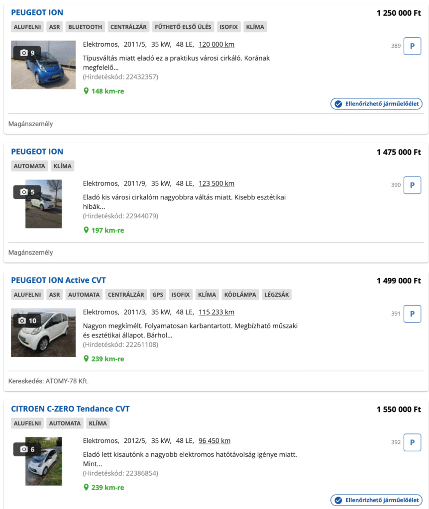 Ez jó hír, hiszen a kínálat hatalmasat nőtt. Ha okosan választasz, a legolcsóbb használt elektromos autók közül szemezgetve már egy megbízható Suzuki áráért is találhatsz csendes, környezetbarát alternatívát. Ha nem kell nagy kocsi, 2010 után gyártott Peugeot ION-okat már bőven 2 millió forint alatt kaphatunk.