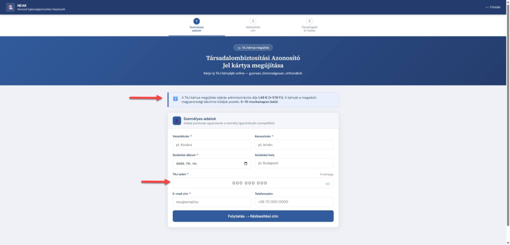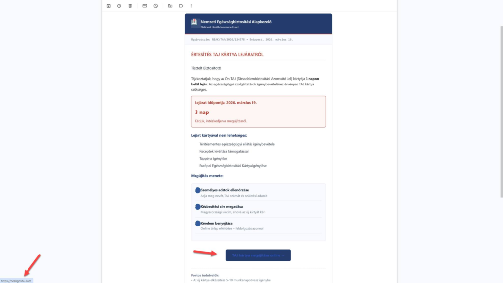 A leggyakoribb ürügy, hogy a TAJ-kártya hamarosan le fog járni, ahhoz pedig, hogy elindítsuk a cserét, egyeztetnünk kell az adatainkat. Az üzenetben szerepel egy link is, ami egy adathalász oldalra vezet. Ne kattintson rá és ne adja meg az adatait!