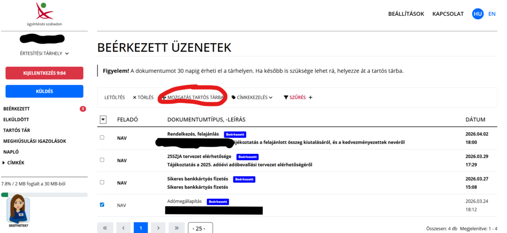 Az ügyfélkapu tárhely törlődés különösen most, az SZJA-bevallási időszakban jelent nagy kockázatot. A NAV ilyenkor küldi ki az adóbevallási tervezetekkel kapcsolatos értesítéseket, a befizetési bizonylatokat, vagy éppen a javításra felszólító határozatokat. Ha valaki csak belép, nyugtázza az üzenetet, majd kilép, egy hónap múlva már hiába keresi a dokumentumot a „Beérkezett üzenetek” között. A NAV által küldött iratokat saját érdekünk megőrizni, mert akár évekig fontosak lehetnek. Gondoljunk az adóigazolásra vagy valamilyen kedvezmény érvényesítésére – bármikor szükség lehet a hivatalos iratokra.